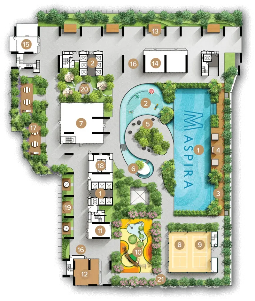 M Aspira’s 1.21-acre lifestyle deck offers a wide range of facilities designed for leisure, wellness, and community living. Highlights include a 50m lap pool, jacuzzi, sky lounge, co-working space, gym, multipurpose hall, BBQ areas, games room, outdoor lounge, children’s play zone, and a surau. Every space is thoughtfully planned to support an active, balanced lifestyle in Taman Desa.